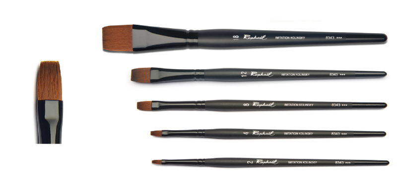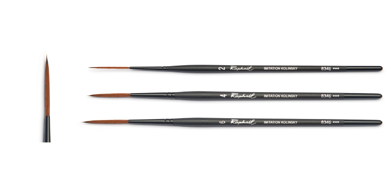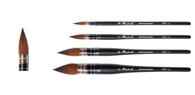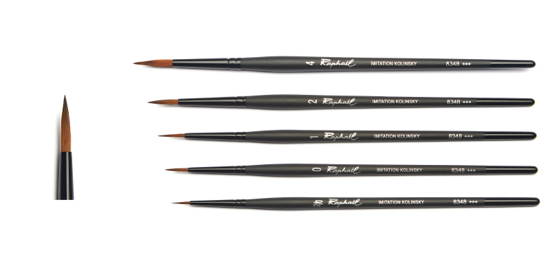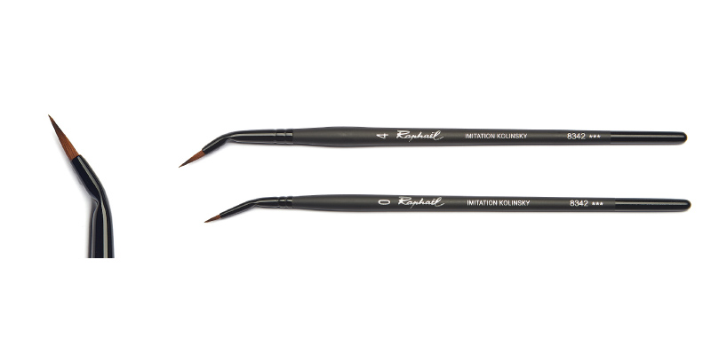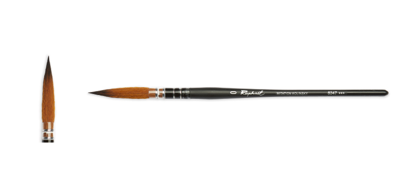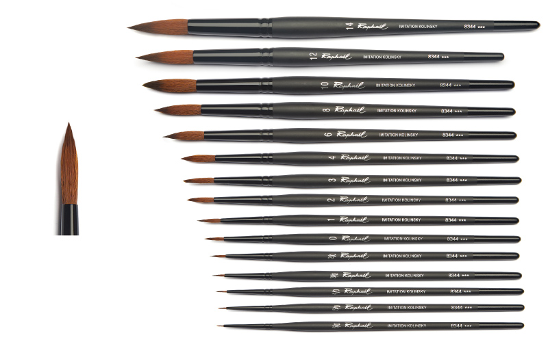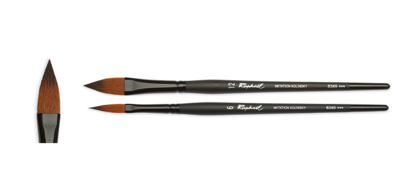水彩画に欠かせない丸筆(8344)はラファエルのベストセラー8404をベースに開発されました。それ以外にも珍しい、羽管、平、薙刀、カーブなどの穂先を取り揃えております。