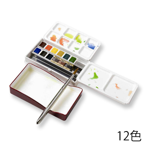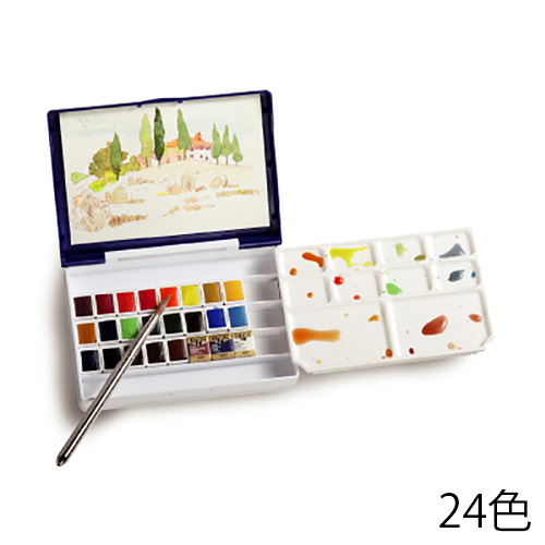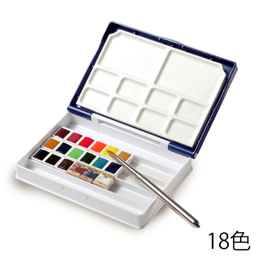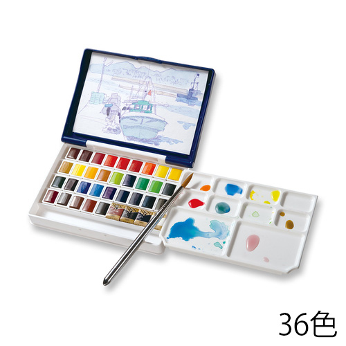 伝統的な顔料に加え、近年開発された新しい顔料も積極的に採用し、彩度や明度が高く褪色、変色の少ない色を選りすぐった、プロの方にもご満足いただける高品質な水彩絵具です。高級水彩紙向けに開発されており、サイジング(どうさ)の強い紙でも弾きにくく、なめらかな水どけと色のびを実現しました。また、パーソナリティを主張する素材をBOXに採用し、屋外での絵画活動をより楽しんでいただけるよう、各色が取り換え可能なカートリッジ方式を導入。田園、山、海、街など描く対象に最適な色を探る楽しみも生まれます。