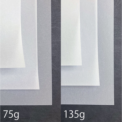設計製図・デザイン用のほか、型紙、イラスト、写し絵、作品の保護紙などに幅広くご利用いただける半透明紙。透過性に優れ、平滑性もきわめて高く、鉛筆やペンなどの筆記具でシャープな線が描けます。温度、湿度の影響による伸縮が少なく、カールも少ないのでスムーズな作業ができます。