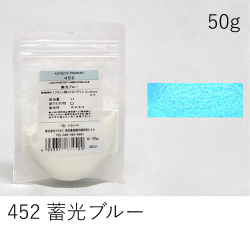 光を蓄積し、暗所で強く発行する顔料です。従来のものは水に弱く、わずかな時間の浸水でも化学変化し、発光しなくなる弱点がありました。しかし、クサカベの蓄光顔料は耐水性があり、短時間の照射で長時間、しかも強く発光します。各種絵具作りや補助材料として、自由な発想でお使いいただけます。