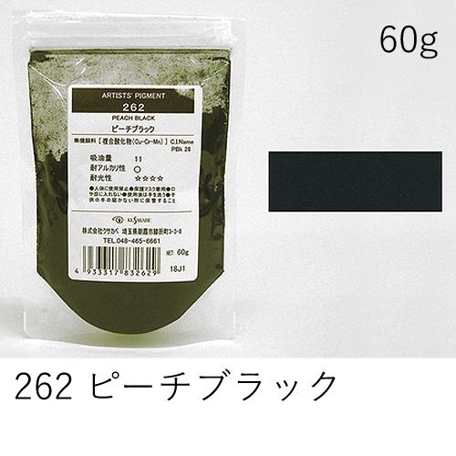 銅・クロム・マンガンを焼いた無機顔料です。もともとは桃の種を焼いていました。高い隠ぺい力を持ち、質感があります。クサカベ油絵具のピーチブラックには使用していません。