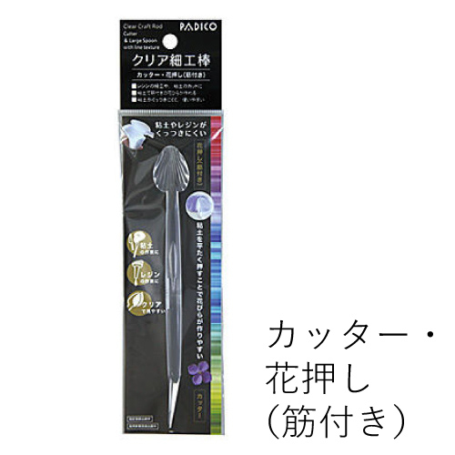 スジ付きの花押しがついていて、スジのついた花びらを粘土で作ることができます。反対側はカッターになっていて、粘土を切ったり粘土に線をつけたりするのに最適です。