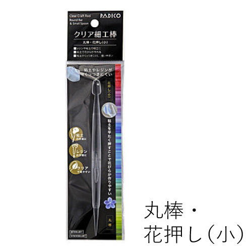 小さな花押しがついていて、反対側は丸棒になっています。花押しは粘土で花びらを作るのに最適です。丸棒は粘土に丸穴を開けたり、線を引いたりするのに向いています。