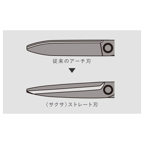 従来のアーチ刃ハサミに比べて刃先が細く、切りたい場所が見えやすい独自設計です。紙工作など細かい作業シーン、線に沿ってカットするトリミングシーンなどに適した、狙って切りやすいストレート刃です。