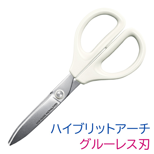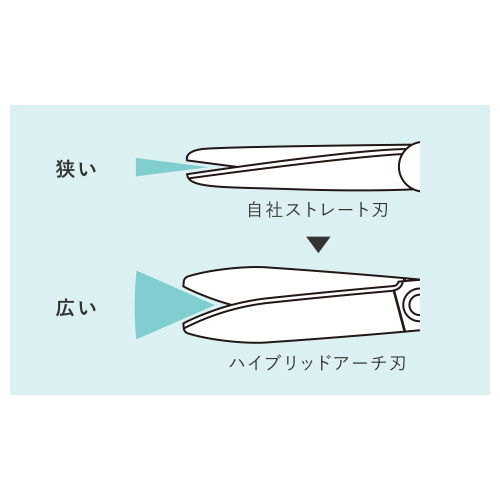 従来のアーチ刃ハサミに比べて刃先が細く、切りたい場所が見えやすい独自設計です。