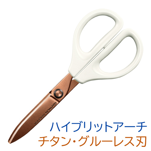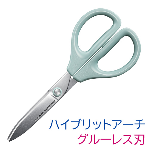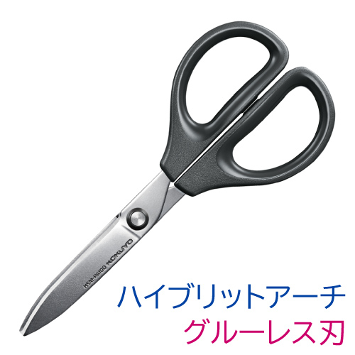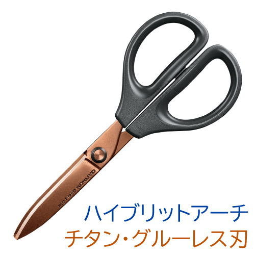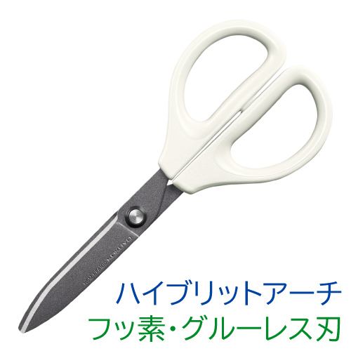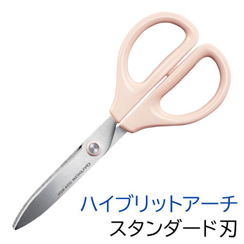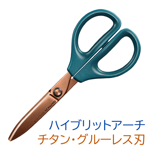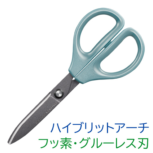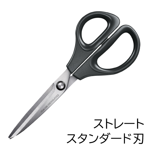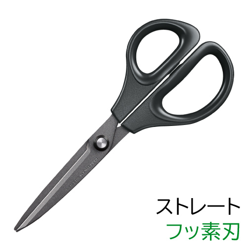 フッ素コーティングを施した、粘着テープを切ってもベタつきにくいタイプ。従来のアーチ刃ハサミに比べて刃先が細く、切りたい場所が見えやすい独自設計です。紙工作など細かい作業シーン、線に沿ってカットするトリミングシーンなどに適した、狙って切りやすいストレート刃です。