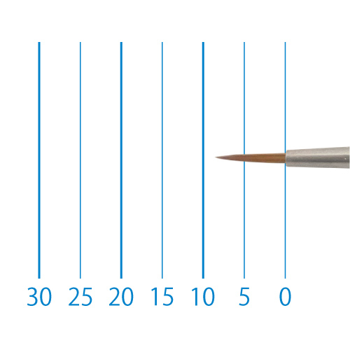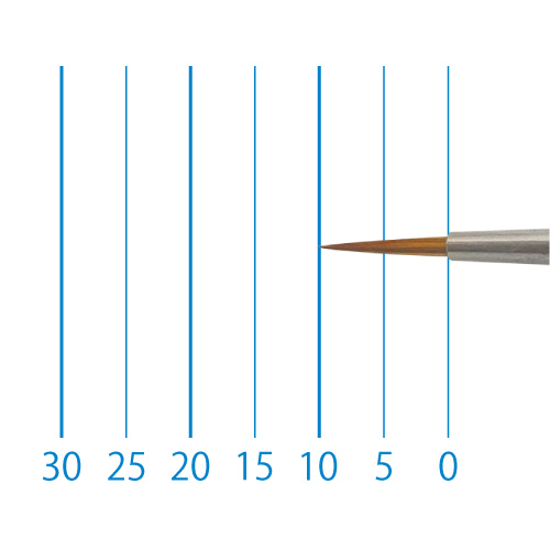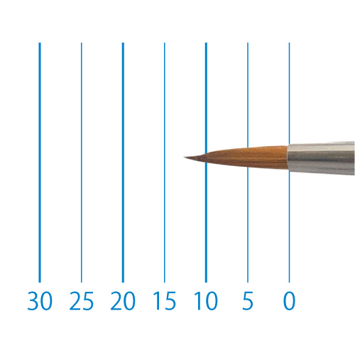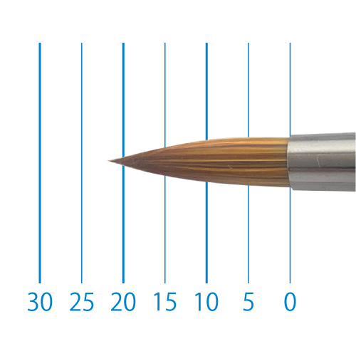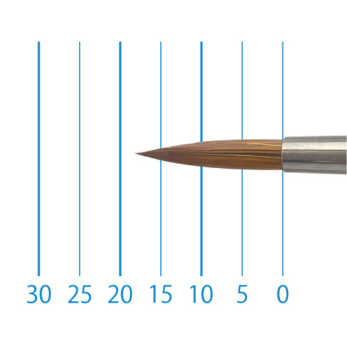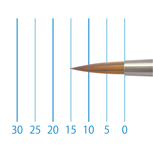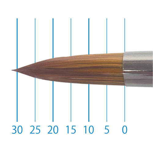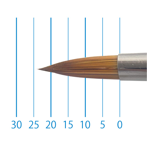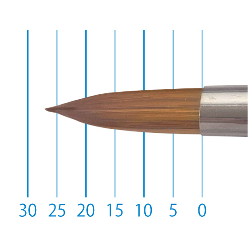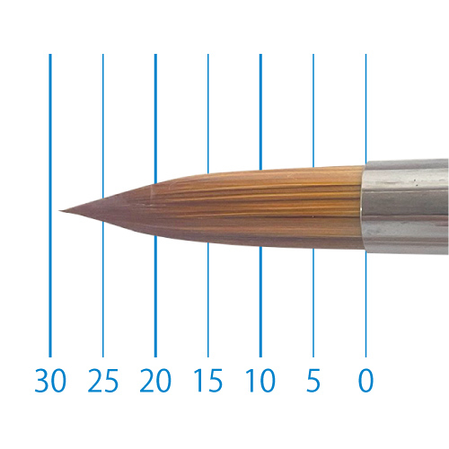 天然イタチ毛を再現した新たな合成繊維と、リセーブル毛を組み合わせることで、イタチ毛に近いしなやかさと絵具の含みに、リセーブルの弾力性とまとまりがプラスされました。よく揃った穂先と程よい弾力で、繊細な再現に最適です。日本製。