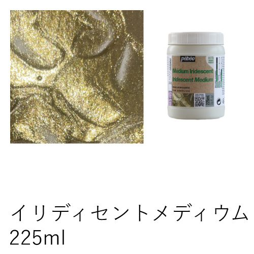 アクリル絵具にメディウムをお好みの分量にて混ぜる(絵の具に対して、10~50%)と玉虫色の光沢と反射効果が得られます。