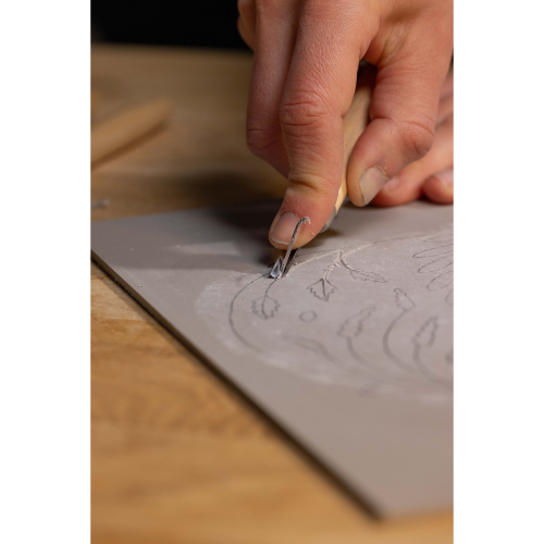 天然素材を使用した版画用プレートです。亜麻仁油(リンシードオイル)、木粉、松脂などを練り合わせ、麻布に圧着して作られた、環境に優しい素材です。リノリウムは柔軟性と耐久性を兼ね備えており、彫りやすく扱いやすいのが特長です。表面はグレーで、彫った部分は白く現れるため、彫り跡がはっきりと見え、作業がスムーズに進みます。木版に比べてカットしやすく、木目による制約や彫り口の剥がれもなく、彫りカスの処理も簡単です。