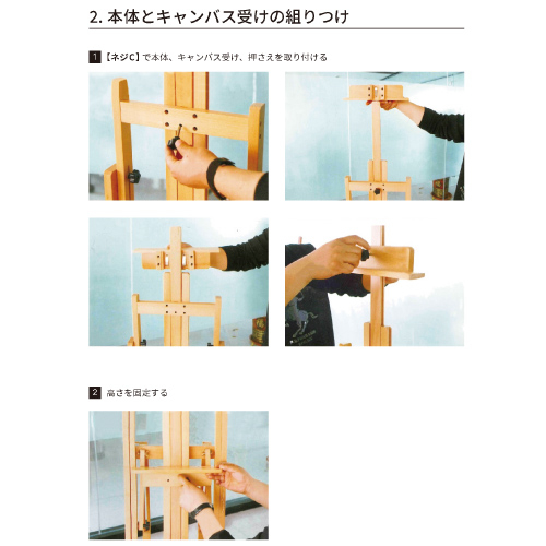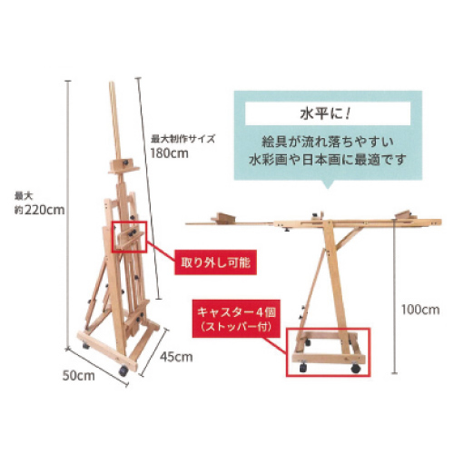 ネジを回して簡単に高さ・角度の調節ができ、角度を水平にすることもできます。水平の角度は、絵具が流れ落ちやすい水彩画や日本画に最適です。