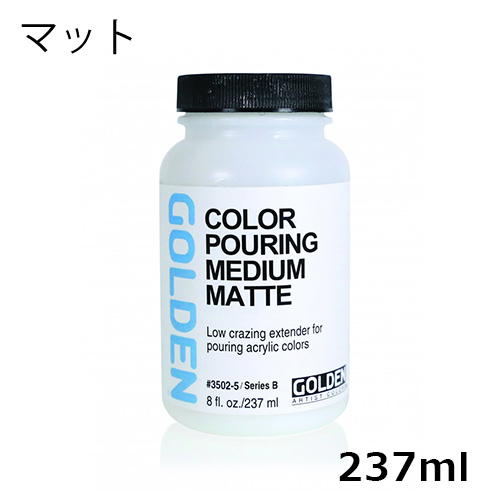 ・レベリング性が高く、アクリル絵具のポーリングを行う際にひび割れができにくいメディウムです。マットタイプでは、ベルベットのようなマットな表面のポーリングを作ることができます。