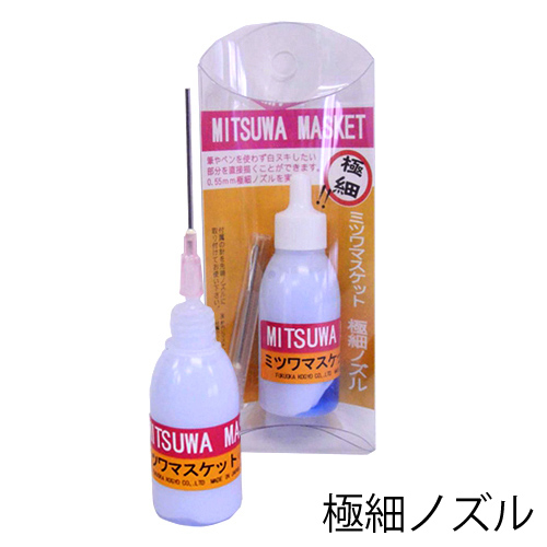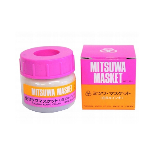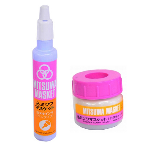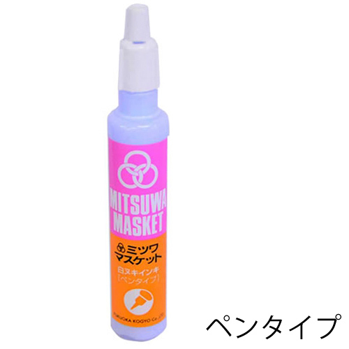 水彩画や漫画、イラストなどでマスキング(白抜き)したいところに使うインクです。白く残したいところに最初にマスキングインクを塗り、乾かしてから色を塗ります。塗った色が乾いたらラバークリーナーでマスキングをこすり取り、完成です。上に塗る色材はアクリル絵の具や水彩絵の具、カラーインク、ペンなどが使えます。マスケットインクで固まった筆には専用の筆洗液をご利用下さい。
