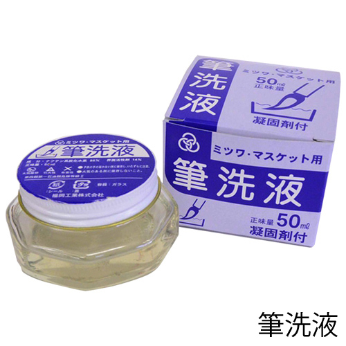 筆についたマスケットが固まった場合、洗剤等では落ちなくなるのでこちらの筆洗液をお使いください。筆洗液に直接筆を浸けゆすぐとマスケットが剥がれます。剥がした後の筆は石鹸で洗って下さい。また、筆洗液を捨てる場合はそのまま流すのではなく、付属の凝固剤を入れて固まらせてからゴミ箱に捨てて下さい。